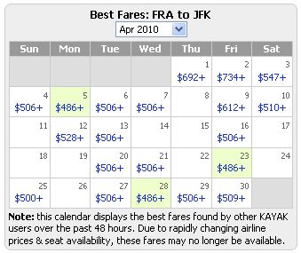Nachdem dies erledigt ist, geht es darum einen günstigen Flug zu finden. Um einen guten Überblick zu erhalten, sei hier vielleicht Kayak.com empfohlen. Dort können Hotels, Flüge und Mietautos gesucht werden. Interessant ist aber ein Kalender, der auch anzeigt, ob der Flug früher oder später nicht deutlich billiger wäre.